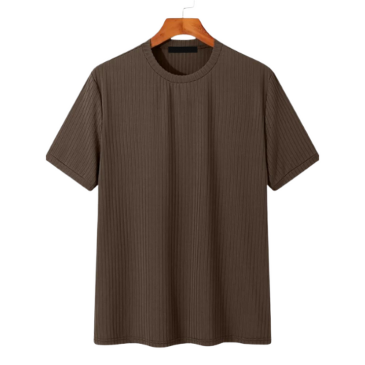 Le t-shirt côtelé tombe naturellement sur le corps sans coller ni remonter. Il offre une silhouette nette et structurée, sans aucune gêne ni contrainte.