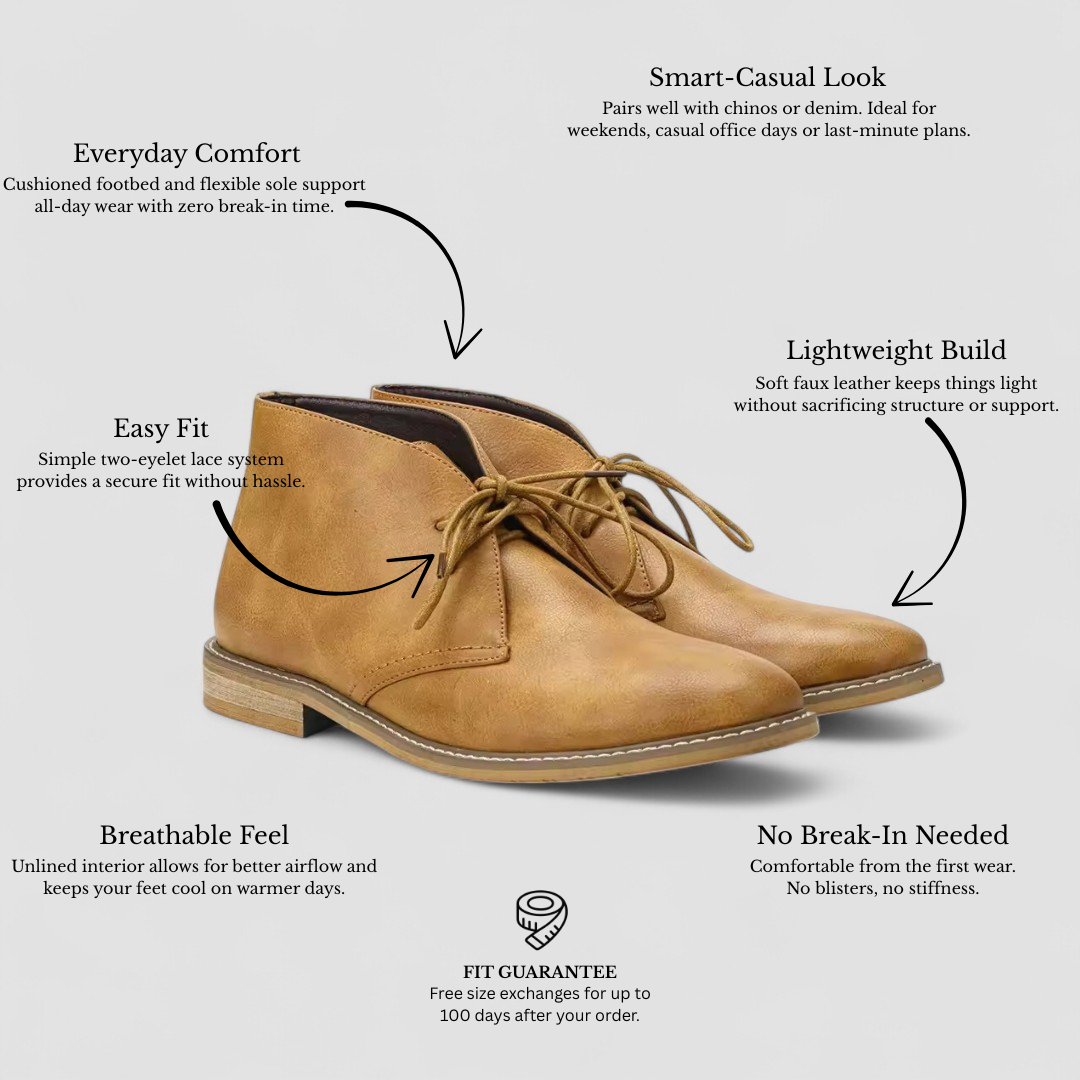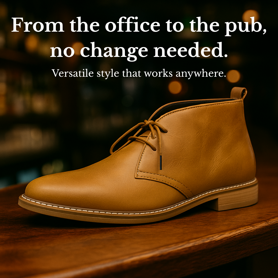 Bold colour, no ego—just pure wearability. Brecon Nº42 is HLW’s most eye-catching desert boot, tailored for men who want their footwear to speak up—but never shout. It’s stylish, light, and ready for anything from market strolls to rooftop drinks. Crafted in Europe from smooth, caramel-toned PU leather and lined in plush microfiber, it gives off the look of a full-grain leather boot with none of the hassle. Lightweight, breathable, and soft from the get-go—no clunky stiffness, no sweaty feet.