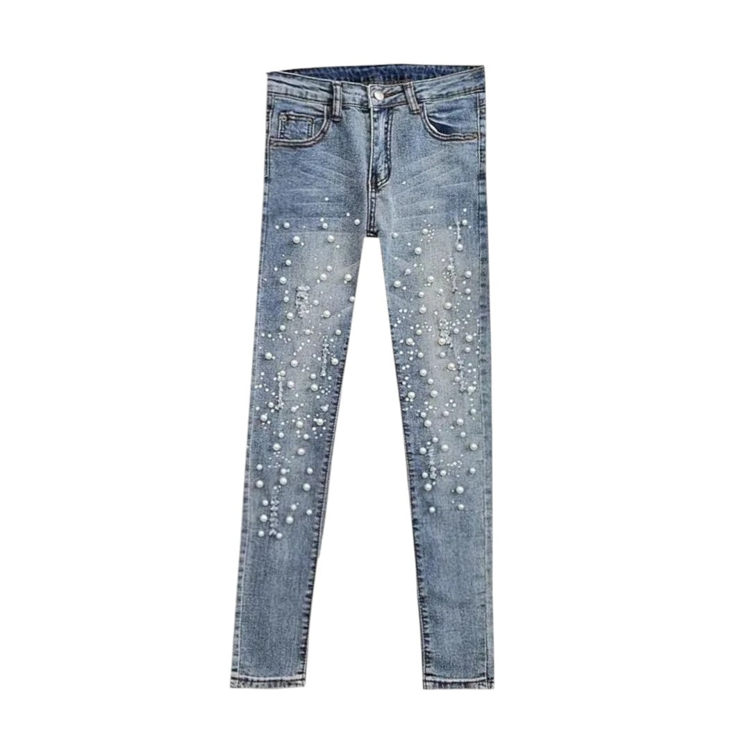 Les appliqués de perles sont répartis solidement du haut de la cuisse à la cheville, offrant au jean une finition tout en douceur et en luxe, sans surcharger votre tenue. L’effet est moderne, féminin et juste assez audacieux.