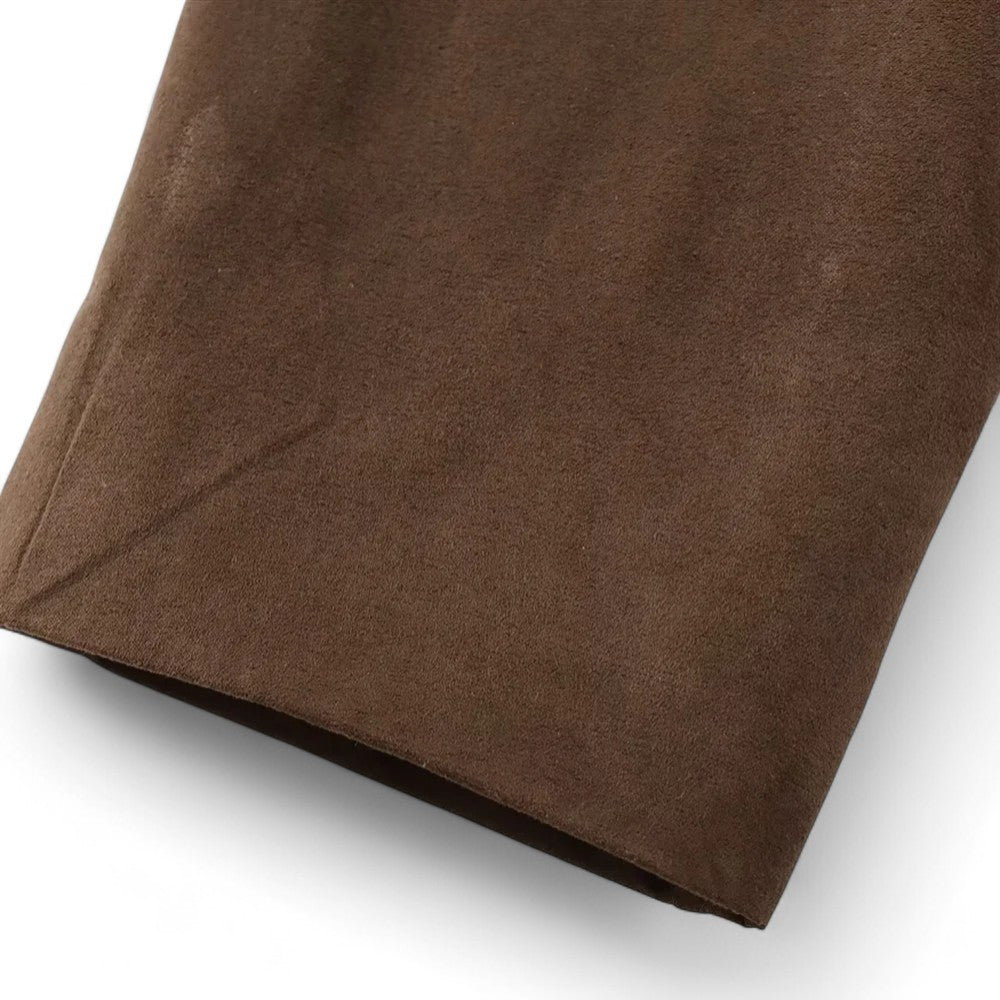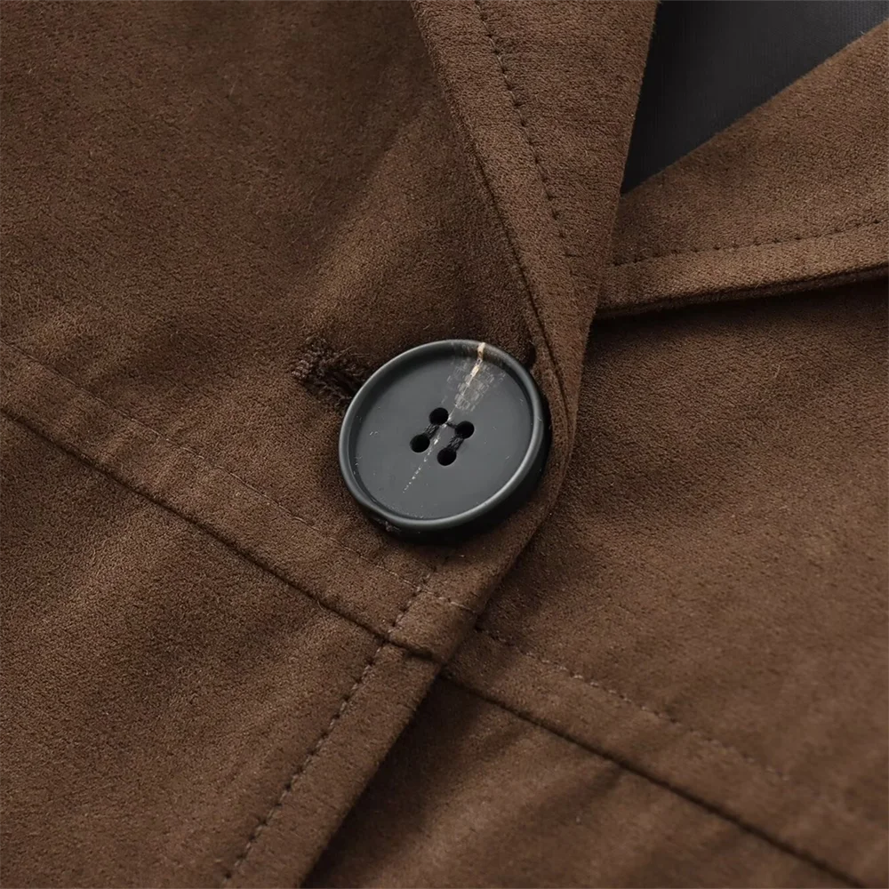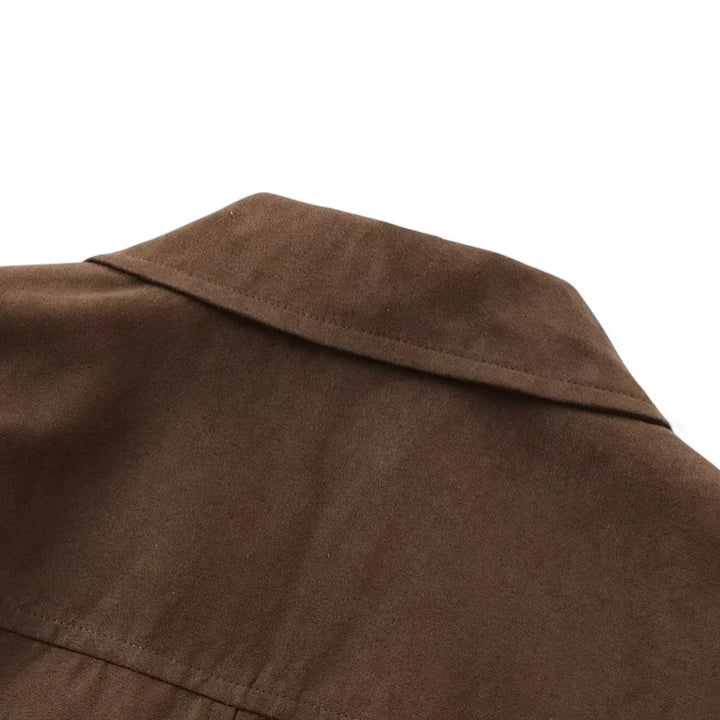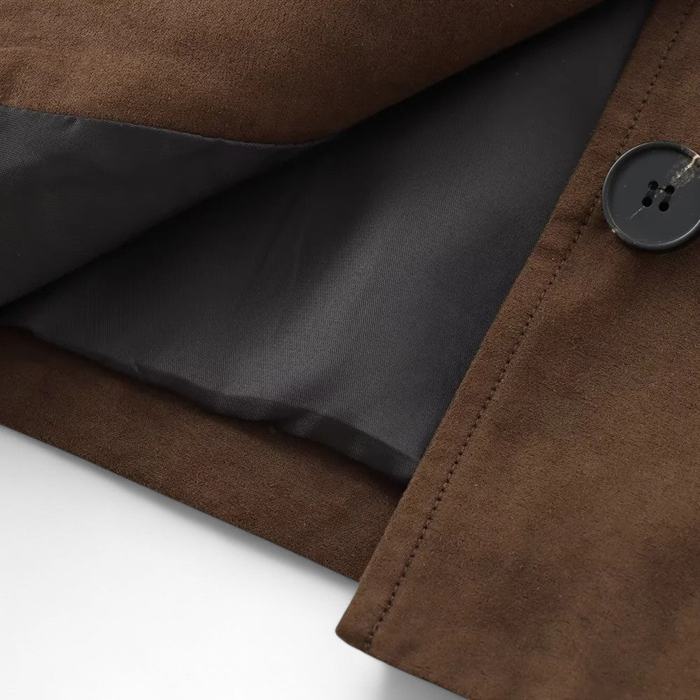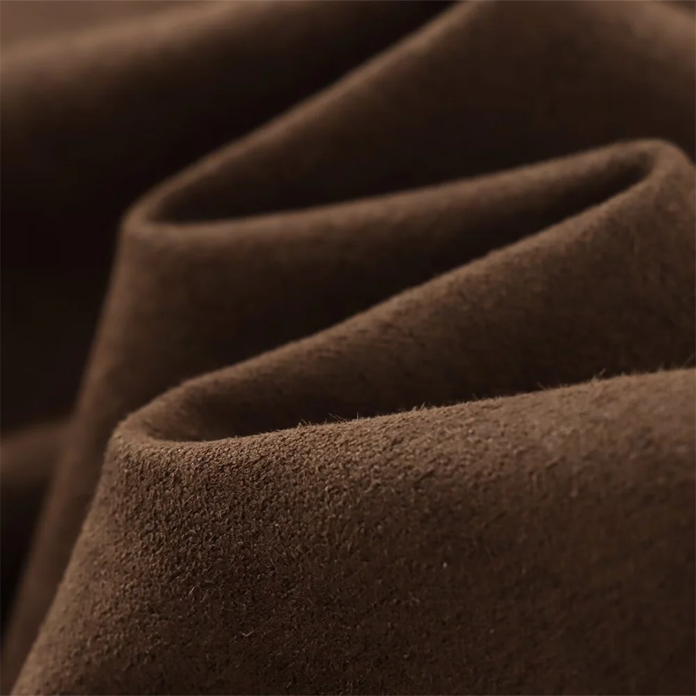 La suédine légère est incroyablement douce, presque peau de pêche au toucher. Elle crée une sensation de confort immédiat dès que vous l’enfilez, comme un vêtement que vous connaissez déjà.