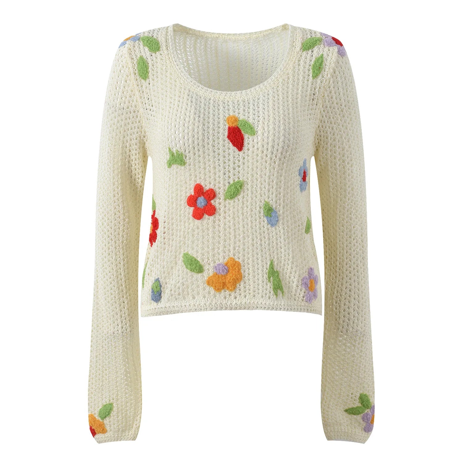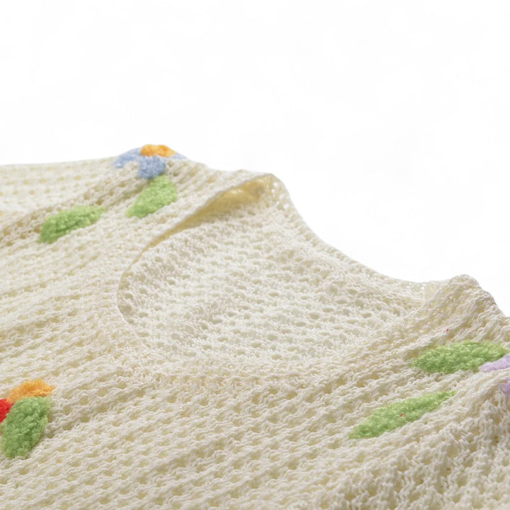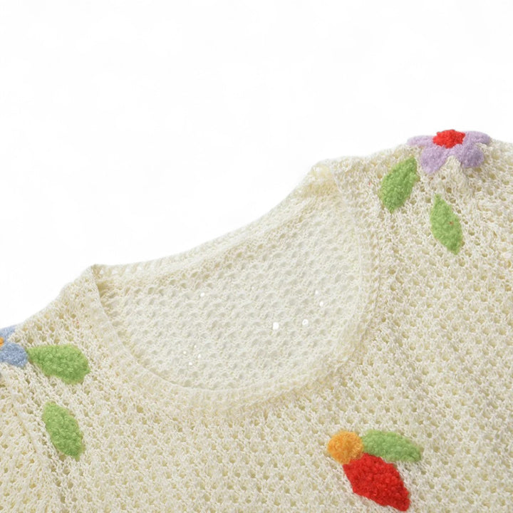 Plongez dans une sensation de fraîcheur avec ce pull filet orné de fleurs en relief. Sa maille ajourée laisse respirer la peau tout en apportant une touche bohème et joyeuse à votre tenue.