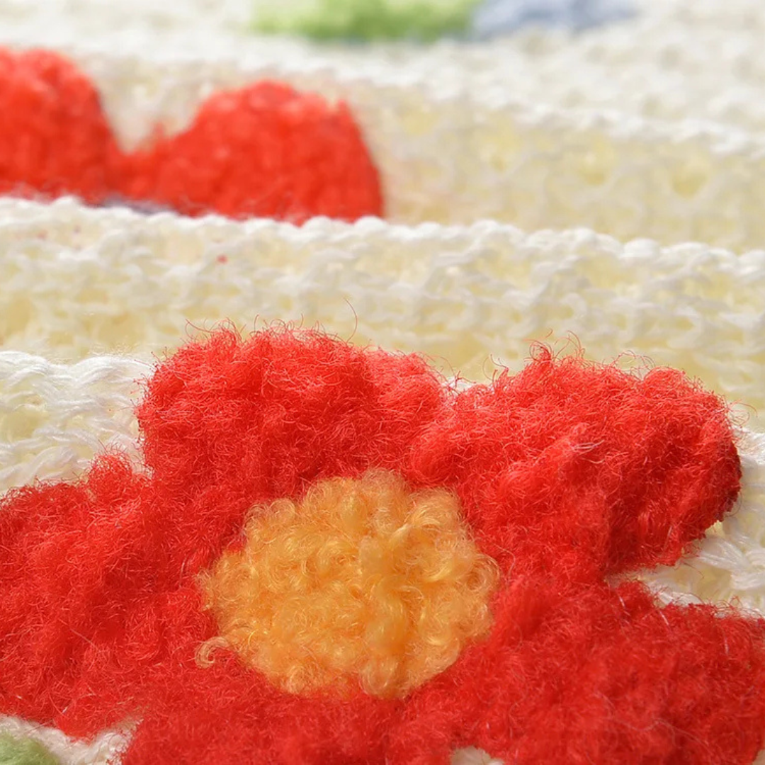 Chaque fleur colorée est soigneusement brodée avec une texture bouclée qui apporte du relief et un charme artisanal au vêtement.