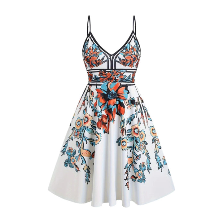 Le contraste entre les tons vifs et les contours noirs apporte une touche artistique unique. Chaque fleur semble peinte à la main, transformant cette robe en pièce forte du dressing.