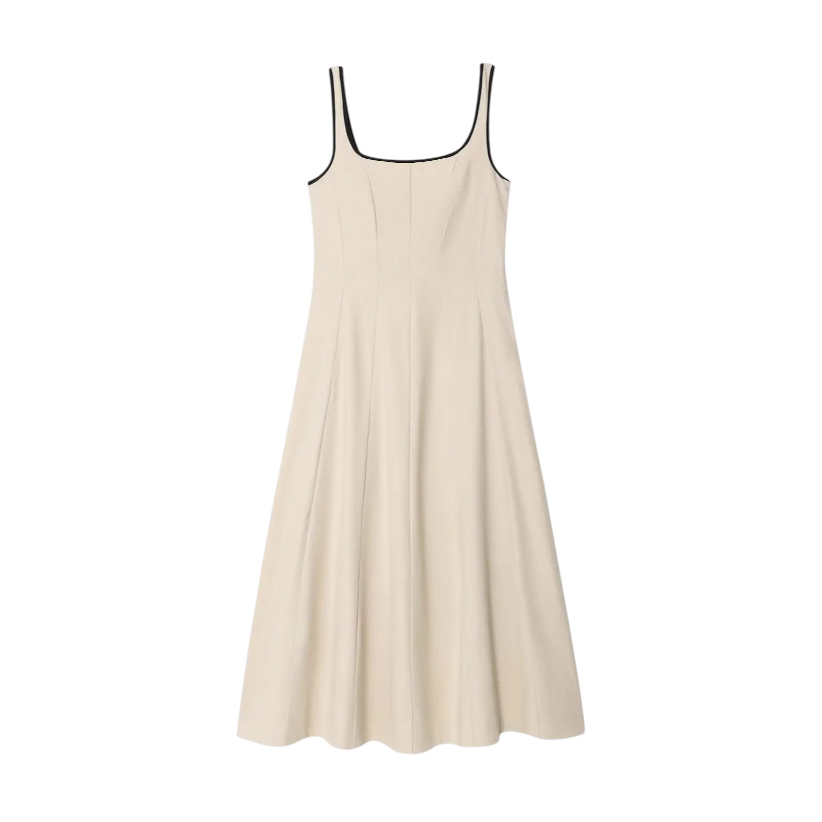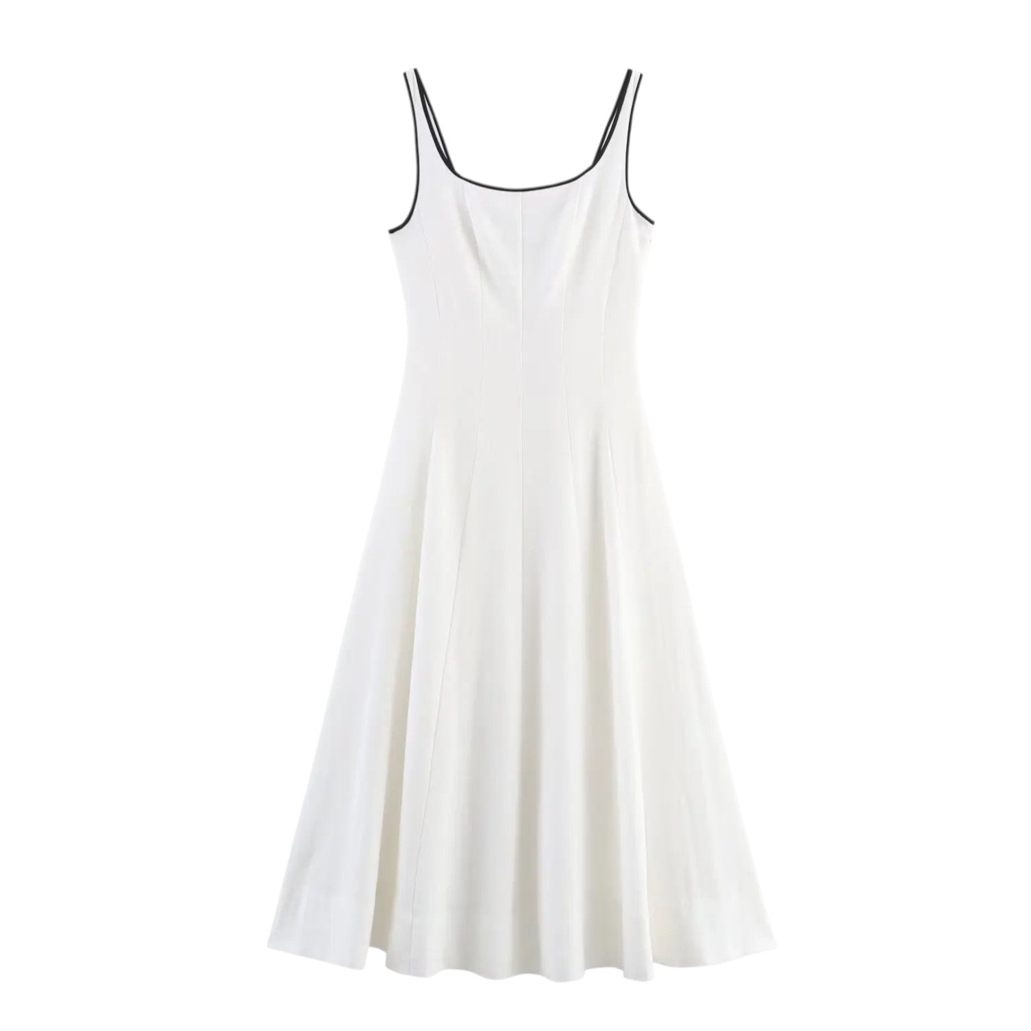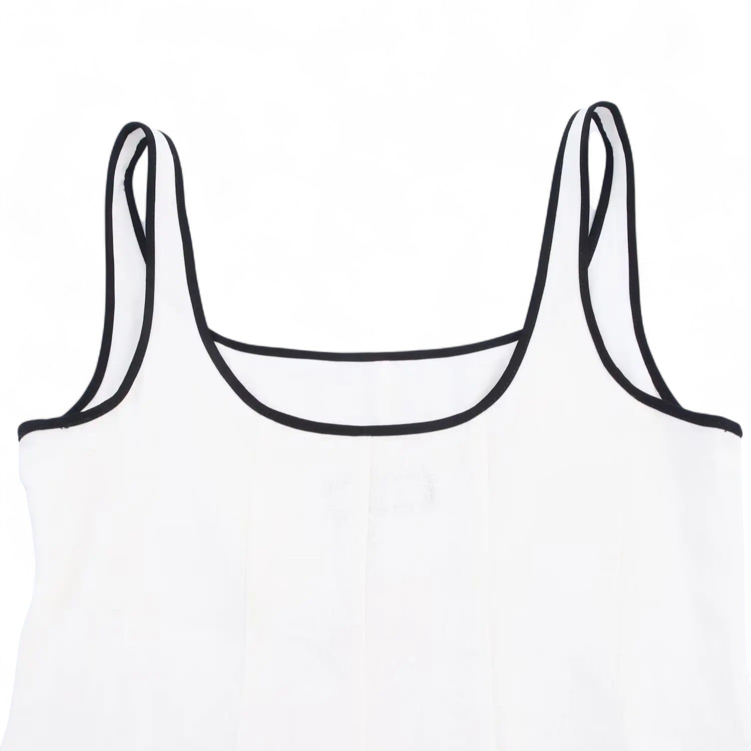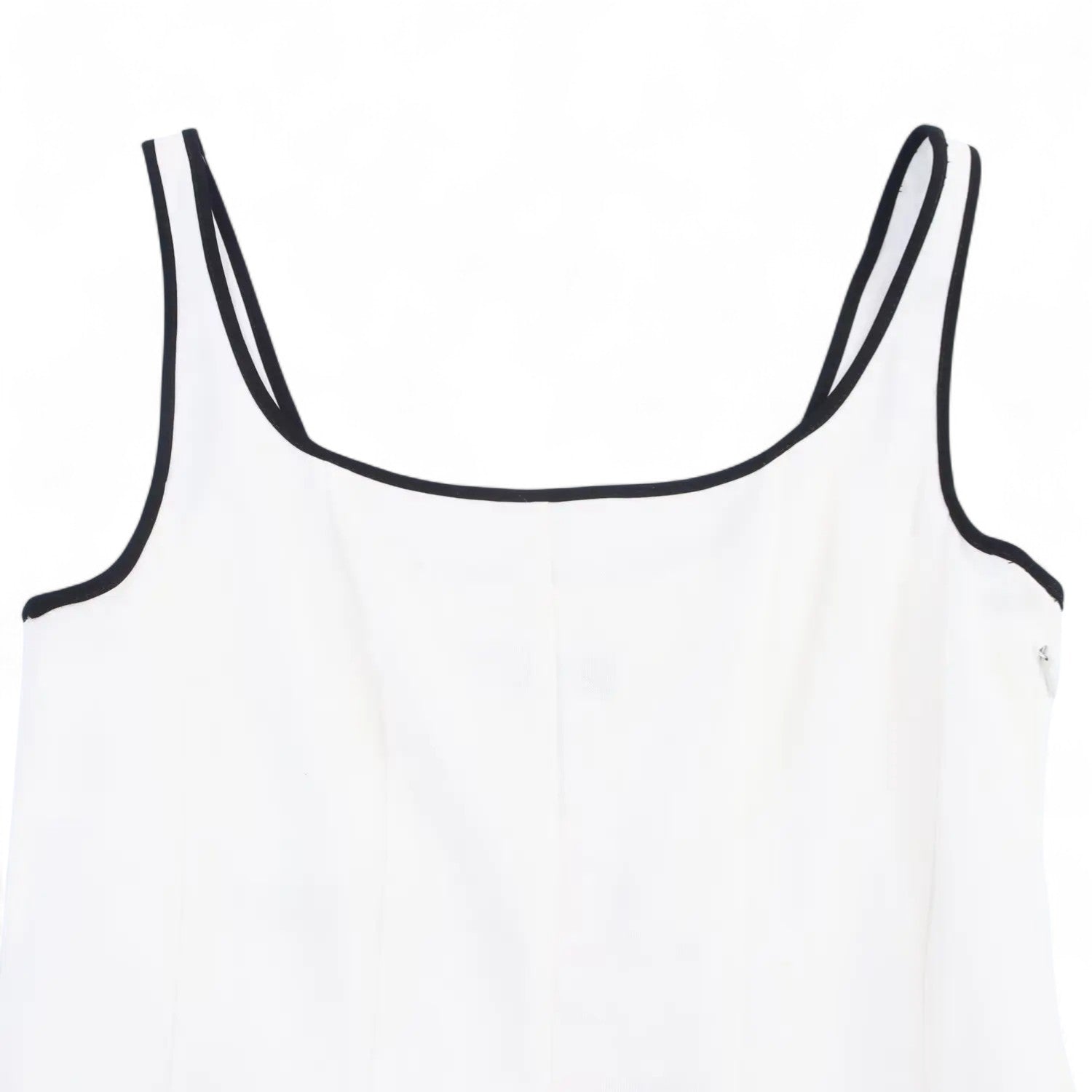 Les bordures noires soulignent les bretelles et l’encolure avec subtilité, créant un effet visuel raffiné qui encadre délicatement le haut du corps.