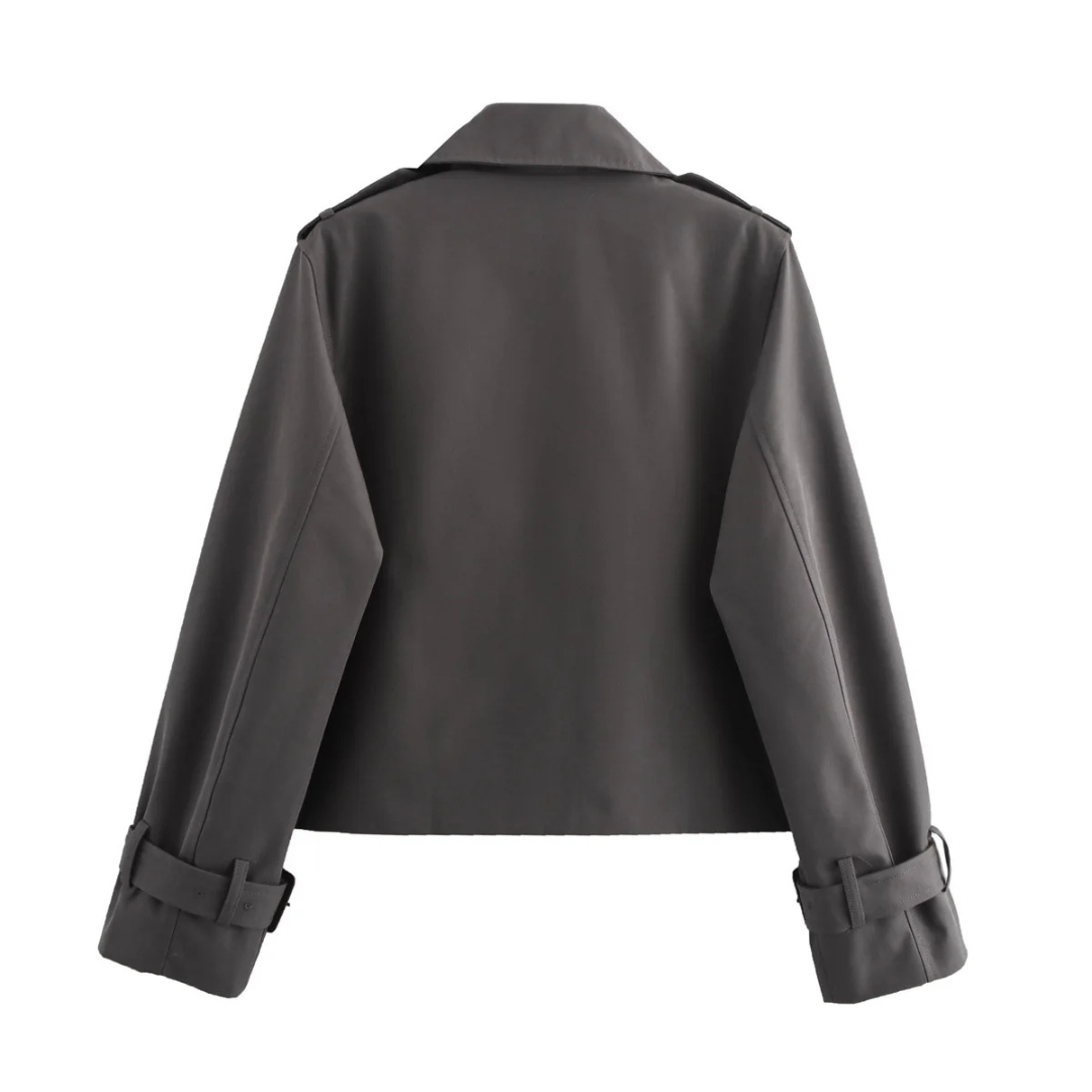 La coupe courte met en valeur la taille tout en conservant une élégance urbaine. Les épaules légèrement marquées et les revers larges apportent une touche de caractère à chaque mouvement.