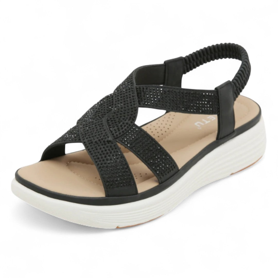Ces sandales combinent légèreté et brillance discrète pour vous accompagner tout au long de la journée. Leur design croisé est rehaussé de strass délicats qui captent subtilement la lumière à chaque pas, tandis que la semelle compensée assure un confort optimal du matin au soir.